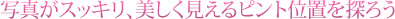 ピントを合わせる位置の違いによって、写真のイメージは大きく変わります。正確な場所に正確にピントを合わせてこそ、撮りたかった被写体が引き立って見えてきます。