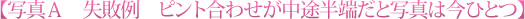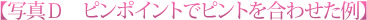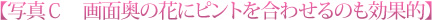 写真Bとは逆に画面の前面はボカし、後方にピントを合わせる方法もあります。