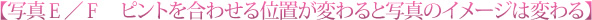 ピントを合わせる位置を変えると、何を表現したいのかという写真のイメージが変わってくる場合があります。写真EとFはその例です。