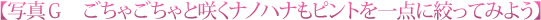 一方、写真Fは手前側のナノハナにピントを合わせています。ナノハナの背後にボカした海を入れることで、南国を思わせるような雰囲気に仕上げています。