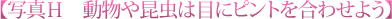 動物や昆虫を狙う場合は、特別な理由がない限り、その目にピントを合わせるのが基本になります。なぜなら、その動物や昆虫のコアとなる部分が目であり、写真がより印象的になるからです。