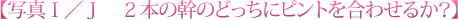 写真IとJは、2本の並んだ幹のどっちにピントを合わせるのかという問題です。