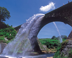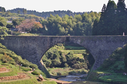 水不足に困っていた農民や住民を救うために、庄屋・布田保之助が依頼、1854年に肥後の石工の技術を用いて建設した石造りのアーチ水路橋です。