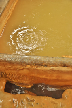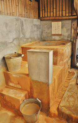 木の扉を開けると茶褐色の湯の色が目に飛び込んできた。