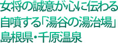 千原温泉は、島根県のほぼ中央に位置する三瓶山南東の沢谷という山あいにある。かつては温泉宿だったが、現在は日帰り湯の千原湯谷湯治場として、地元の常連さんに愛されている。