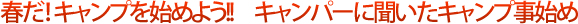 春はキャンプを始める季節、キャンプをやってみようという思いが芽生える季節なのだ。その理由はたくさんあるが、今回はベテランキャンパーたちにキャンプを始めるコツを聞いてみた。