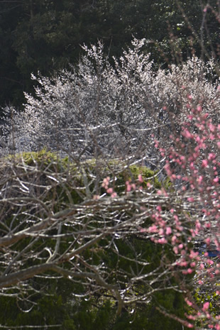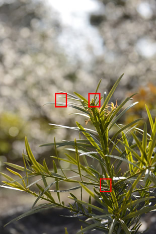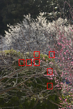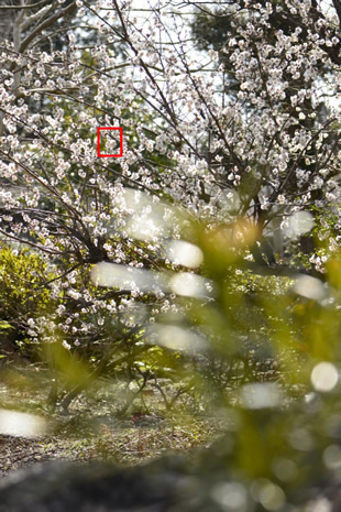 これを解決するには、意図する場所に近いフォーカスポイントを自らが選び、ピントを合わせることです。写真Bは、そのように設定してウメにピントを合わせた例です。