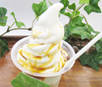 小腹にたまるというよりもスイーツだが、これはぜひ食べておきたい。1日1000個を売る大ヒット商品。蒜山ジャージー牛乳を使用したソフトを自家製プリンの上に!(390円)