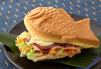 もう食べましたか? 一度食べるとやめられない、鯛焼きの中はキャベツにベーコンのまさにお好み焼き。周りはさくっと、中はふわっと。斬新な鯛焼きをぜひ。(220円)