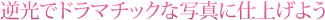 逆光写真は、露出設定如何によって被写体をより引き立てたり、損ねたりすることもあるのが難しい点です。また、仕上がりのイメージがしにくいのも逆光写真を難しくしています。