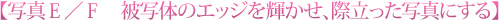 背景に溶け込んでしまっている写真Eに対し、写真Fの花はエッジがキラキラと輝き、背景から浮かび上がって見えます。これが、逆光で写真を撮るもうひとつの狙いです。