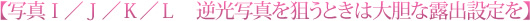 逆光で撮影する場合、カメラが算定した露出(写真K)に対し、「露出補正-1.5段」相当の補正をした写真が写真Lになります。