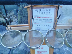 このコーナーで以前に鎌倉の銭洗弁財天を取り上げましたが、ここにも小さなカゴがあり、訪れる人はカゴの中に小銭を入れて洗っていました。