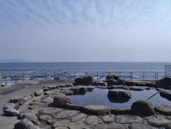 もうひとつの「高磯の湯」は海岸沿いの大露天風呂です。目の前はすぐに海。沖には伊豆の島々が眺められます。