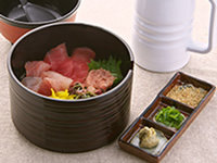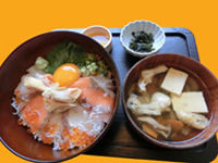東北名産のサーモン、イクラ、鯛、しらす、ツブ貝が丼の中にたっぷり。東北ならではの海鮮丼だ。さらに、「まめぶ汁」が付いていて、それも人気の秘密。同エリアでは三陸産のイクラ丼も評判。