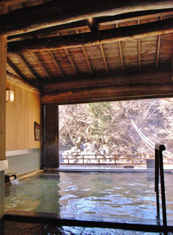 日帰り入浴では残念ながら、滝に近い2面が開放している浴場は女性湯としてあてがわれていたために、体験することができなかったが、季節の風景を楽しめるだけでなく、夜はライトアップされていて秘境ムード満点。