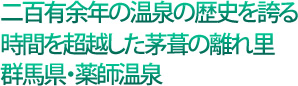 浅間山をすっぽりと隠して見えなくなることから名づけられた、群馬県・浅間隠山。草津街道からわずかに外れたその山懐に、茅葺屋根の集落からなる温泉がある。その湯のよさから「薬師温泉」と命名され、江戸時代より親しまれている。