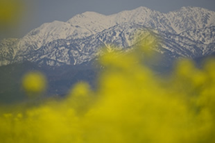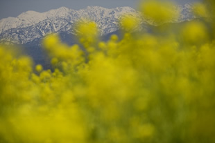 ただし、今回のテーマとは逆の余談になりますが、ナノハナも山も両方見せたい場合は露出を絞ってみてください。このときのピントの位置は、通常奥の山(写真J)ではなく手前のナノハナ(写真K)になります。