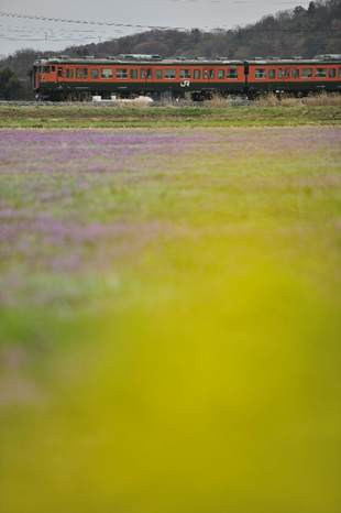 ナノハナを前ボケにして、山との間にあった住宅を隠すことが狙いです。結果として山のすぐ間近でナノハナが咲いているような印象になりました。