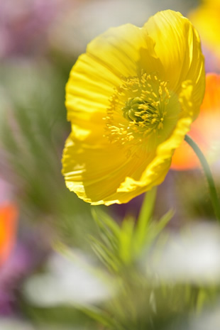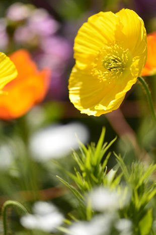写真L/Mは黄色のポピーを狙った写真ですが、写真Lはレンズ前15センチくらい、写真Mはレンズの目の前に白い花を入れて撮影しています。