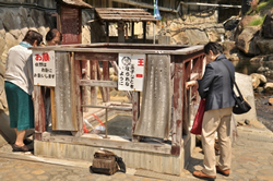 湯の峰温泉公衆浴場を訪れ、つぼ湯の入浴を申し込むと、交代制で30分ごとに1組の入浴が可能になっている。