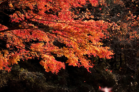 このように紅葉を狙うとき大切なのは、画面を引き締め、明暗差で紅葉の色を際立たせる黒っぽいものを一緒に狙う技法です。