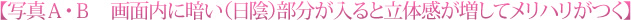 写真Bは、日が当たったことでメリハリがついたのはもちろんですが、谷になった部分の陰(黒っぽいもの)が入ったために明暗のメリハリがつき、画面が引き締まって見えます。また、立体感も引き出され、この部分の起伏が見て取れます。