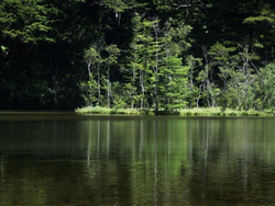 明神岳の伏流水が湧き出すために透明度の高い池には岩魚が泳ぎ、森の中からひょっこり鹿が顔を出しそうな雰囲気が漂っています。