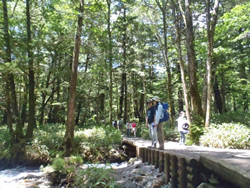上高地で散策時間を設けた観光バスツアーの乗客たちが、「まずは行ってみましょう!」と、気軽にハイキングするのが明神池へのルートでもあり、左岸右岸ともに遊歩道が整備されています。