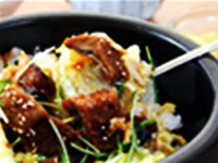地元で獲れたイワナを蒲焼にして、石焼鍋でひつまぶしに仕上げたメニューです。アツアツご飯とかき混ぜてから召し上がってください。タレとイワナの香ばしさが食欲をそそります。ひつまぶしといえばウナギですが、イワナのおいしさに驚くのでは!?