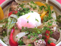 蔵王高原豚のみそかつに山形名物の玉こんにゃく、いか人参、蔵王菜などの地元食材をふんだんに使った丼に、白石温麺がセットになっています。地元食材に舌鼓を打ち、温麺に身体がほわっと。丼と温麺を交互に味わえばおなかも冷えた身体も満足します。