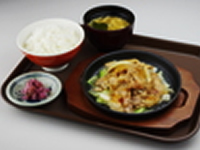 折爪の名物ポーク「佐助」を玉ネギと一緒に十和田で人気のバラ焼きのタレで炒めた料理。なんといってもうれしいのは、アツアツ鉄板で提供されること。鉄板の上にキャベツを敷き、その上に佐助が載っています。いつまでもあたたかく食べられます。