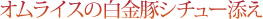 トマト風味のあったかライスを卵で包み、その上から白金豚を使用したデミグラスソースのポークシチューをとろーり。テレビの宣伝も盛んですが、冬といえばシチュー。オムライスとシチューのドッキングは冬にうれしい限りです。ぜひ、お試しを。