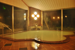 内湯の外に六角形の半露天風呂があるのだが、内側の浴槽と露天風呂の浴槽がつながっており、ガラスのトビラを開けると湯に入ったままで行き来できるようになっている。