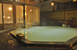 内湯には白濁した湯がなみなみと湛えられており、ぜいたくにかけ流しされている。
