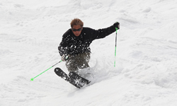 ハイスピードなのにスキーが浮かない。斜面をなめてくる。コブの頂点ではストックより頭が低くなる。ヒザが深く曲げられている証拠だ。