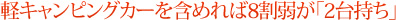 軽キャンピングカーと乗用車、トレーラーとヘッド車(トレーラーをひくためのクルマ)と乗用車という組合せを加えれば、なんと8割弱にもなります。