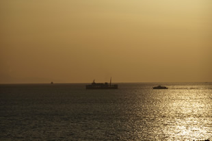 夕暮れの海に浮かんだ船を中央にしたまま撮った例(写真F)。