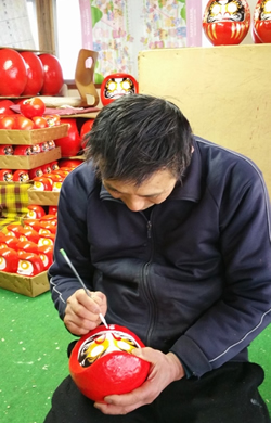 以前は100軒あっただるま店が今では50軒ほどになったそうですが、それでもだるま市への納品はたいへんな作業。岡田だるま店ではすでに完成品を100体以上納めてひといき、開店休業状態で店内のだるまは未完成だったのです。
