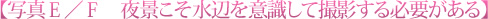 2枚の写真を比較すると、写真Fのほうが華やかなイメージに仕上がっているのがおわかりいただけると思います。夜景を撮るならば、多少欲張りな構図になってしまってもいいので、水辺に映る光を活用するのが得策です。