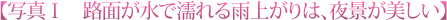 水に映る「第二の風景」の話をしてきましたが、水辺がないとダメかといえばそうでもありません。例えば雨上がりなどは、濡れた路面などにライトや周りの風景が反射し、輝いていることがしばしばあります。