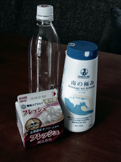 ペットボトルに入れたのは乳脂肪分45%のクリーム。42%以上の高脂肪のものを使うのがおすすめだ。