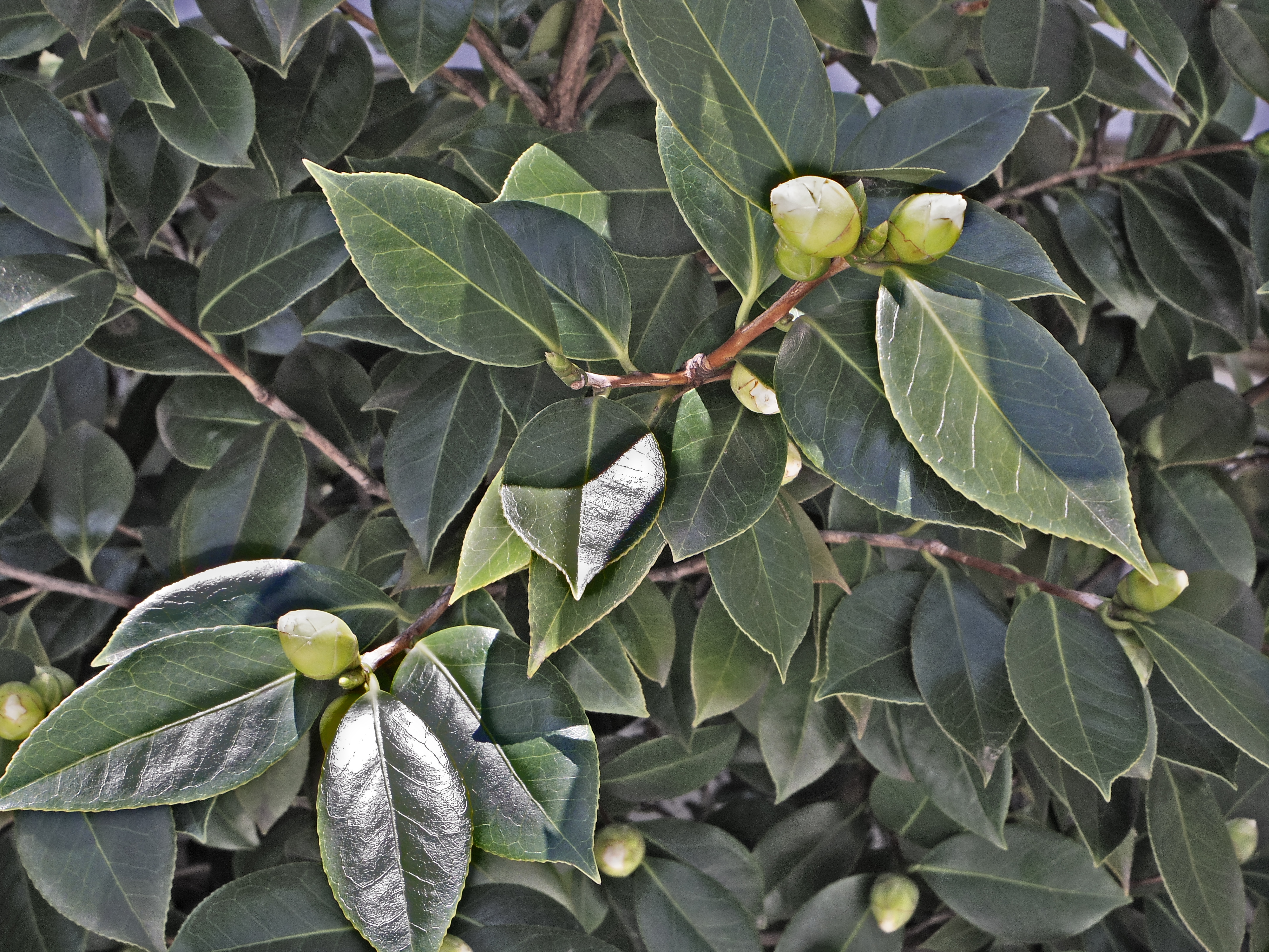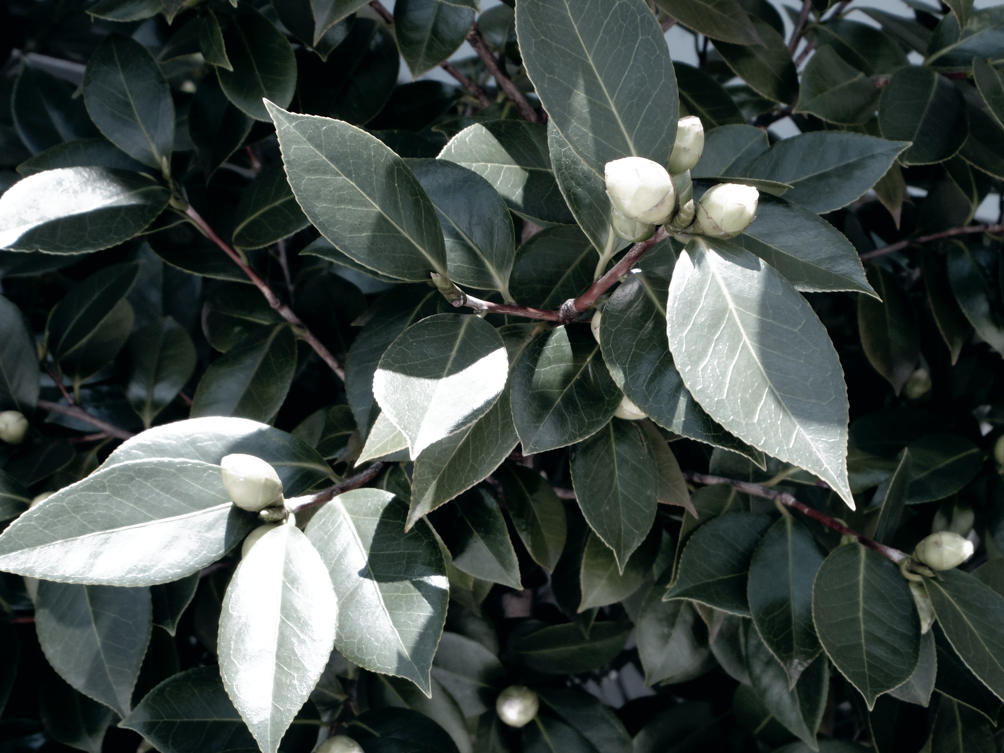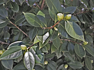 寒い時期に花をつける花があり、そんな木が筆者の住む庭に植えてあります。小さかった蕾もやっと大きくなりました。普通に撮影してもつまらないので、最先端のカメラのフィルター機能を使ってみました。同じ被写体でも、こんなに変わるものなのですね。