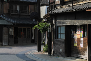 古い建物を残す旧街道の街並みですが、時代とともに新しい建物や近代的な電線などが張り巡らされています。
