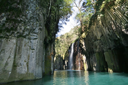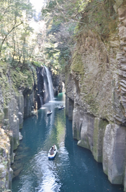 高千穂峡は阿蘇の火山活動によって噴出した火砕流が流れ出し、急激に冷やされたために柱状節理の岩をもつ渓流になりました。