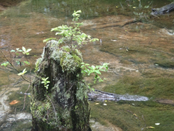 そこで、思い切って主題を変えようと周囲を探すと、写真Fの中央奥に苔のついた小さな岩を見つけました。しかも、その奥には小さな流れ込みもあったので、そこを背景に「緑」の岩を主役に狙ってみました(写真G)。