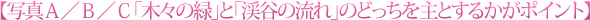 これまでの解説で疑問となるのが「緑」と「流れ」のどちらを主役にするべきかということでしょう。