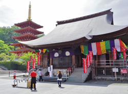 護摩木に願いを書き込んだあとは境内の散策です。赤がまぶしい五重塔、新緑に包まれた大師堂、聖天堂、境内の奥に位置する大日堂(鳴り龍天井があります)と参拝してまわります。