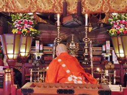 不動明王の前の壇には護摩木が置かれています。お護摩の火は不動明王の“知恵”を象徴し、薪は“煩悩”を表すそうです。不動明王の知恵の炎で護摩木を焼きつくし、それをもって信徒の願いが清浄なものとなって、やがて成就すべく祈りが捧げられます。炎を前にした僧侶の姿が心に残りました。