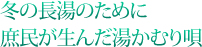 頭をすっぽりと覆うように手ぬぐいを乗せ、柄杓で湯をすくって頭の上からかける。いつしか拍子をとって歌うようになったことから、「湯かむり唄」という名で知られるようになった。
